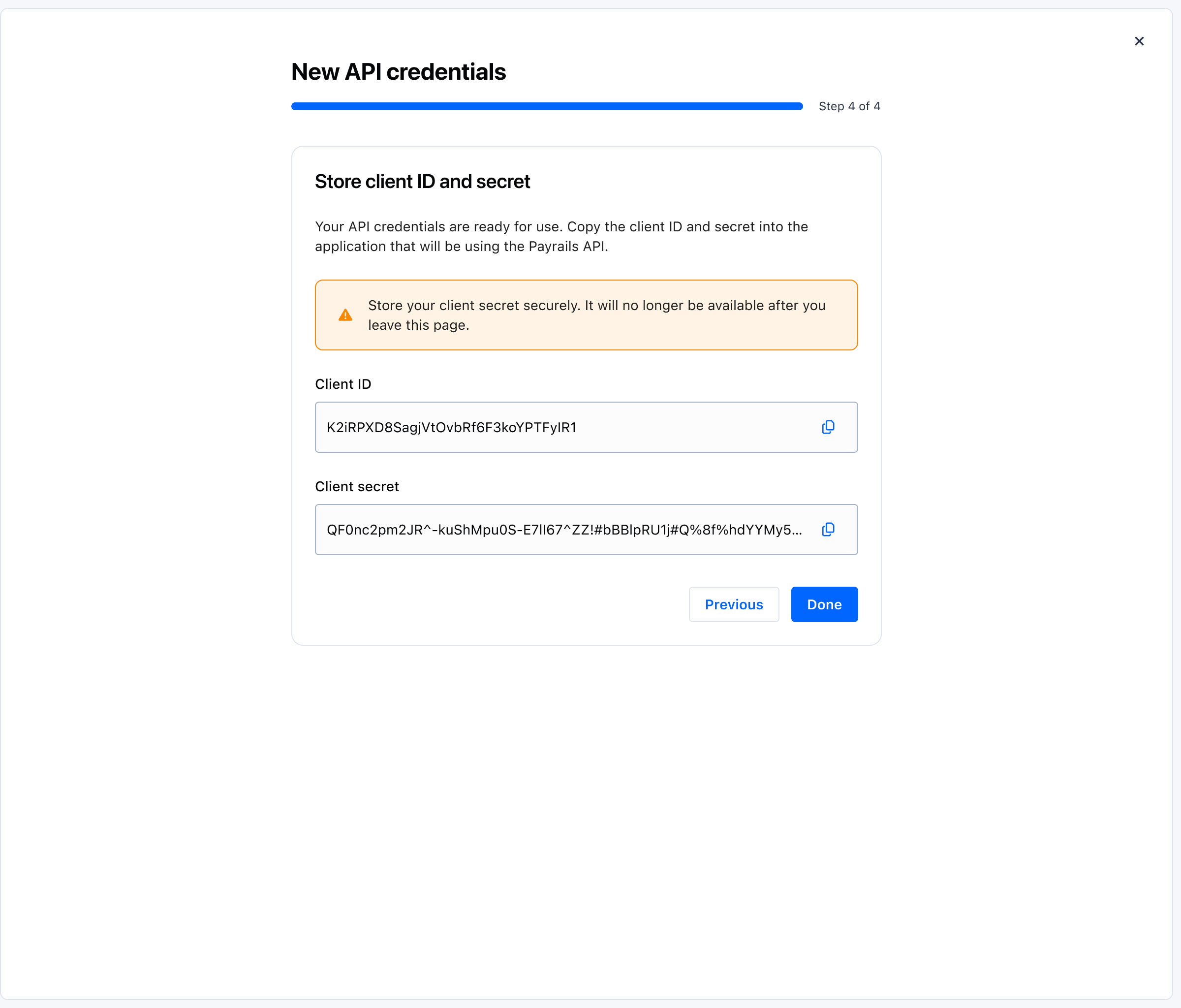 - Copy both values and store the secret in your secrets manager. The secret is displayed once during creation.