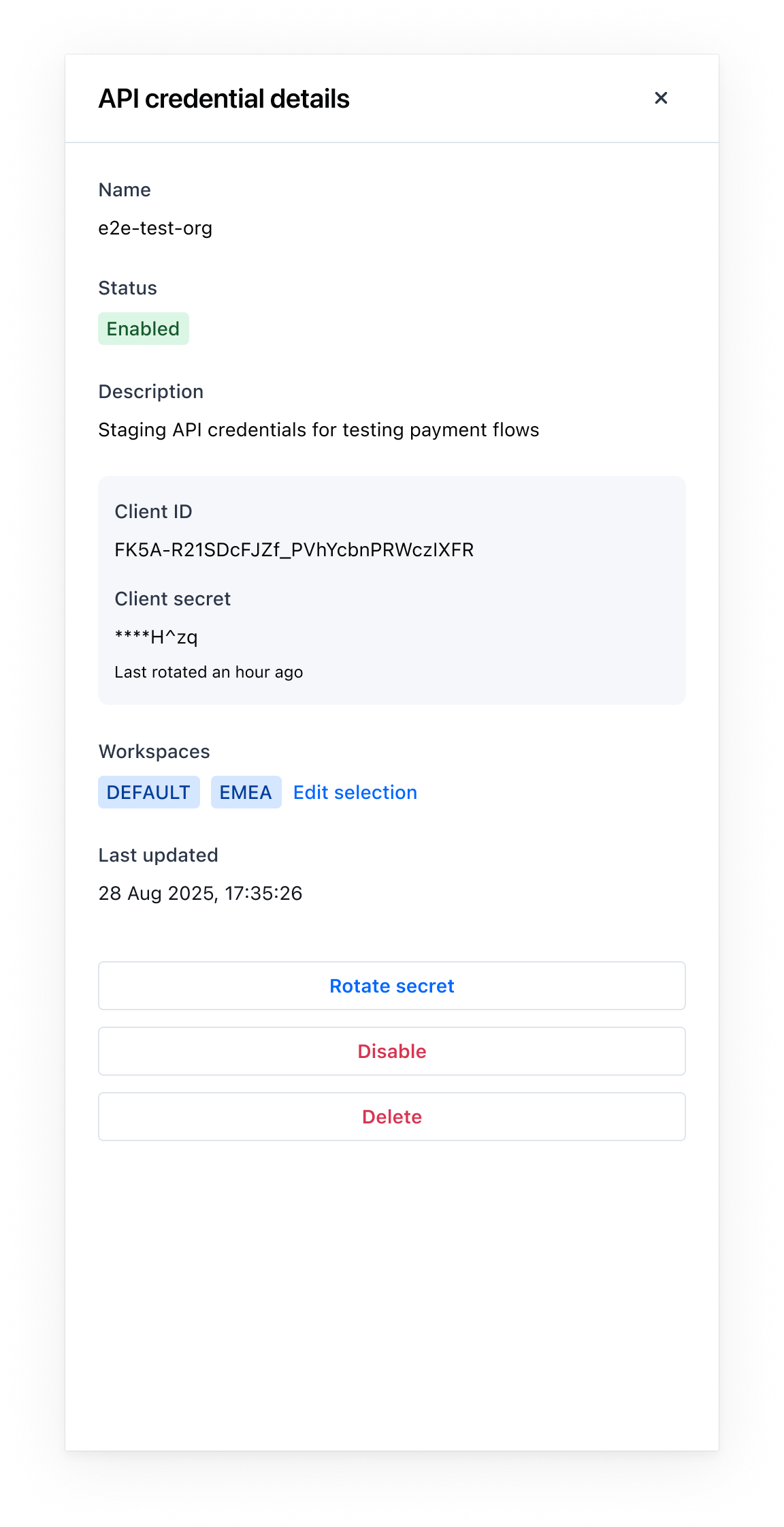 API credentials are created and managed in the Payrails Portal. The Client ID and Client Secret are the credentials you use to start interacting with the Payrails API in both staging and production environments. Credentials are scoped per environment and can be created at the organization level or for a specific workspace to match your operational model.
