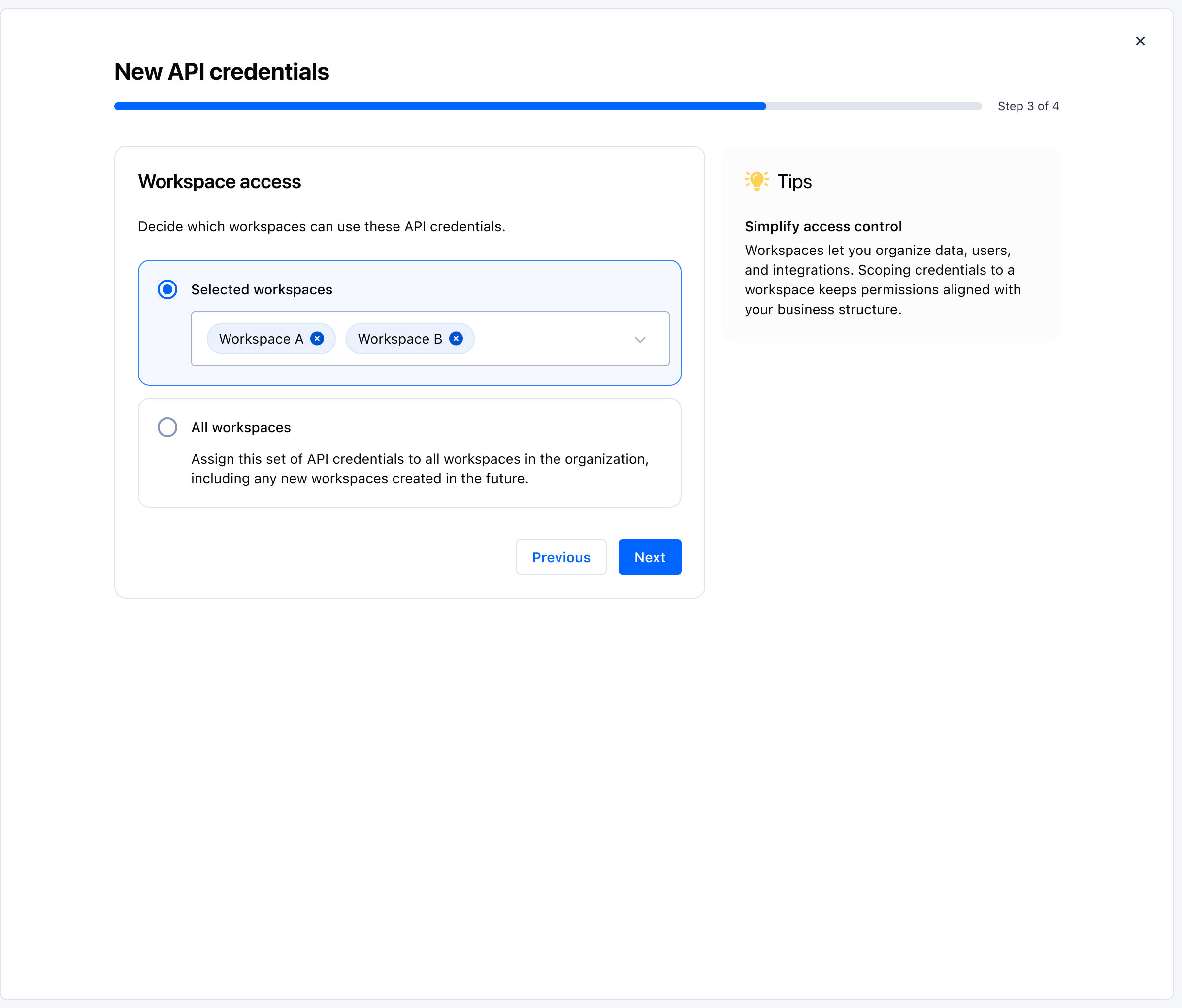 - Workspace — credential is limited to a selected workspace. Choose the workspace from the selector.
