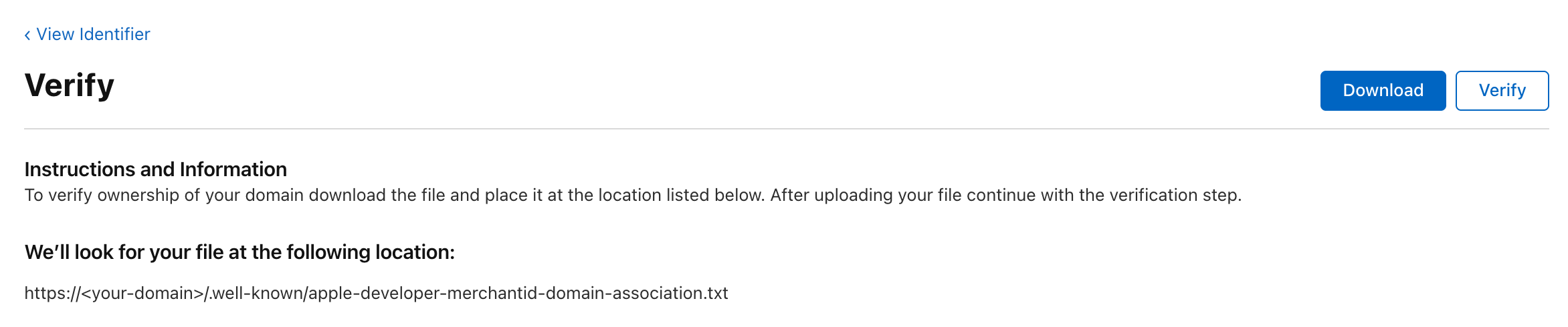 https://<your domain>/.well-known/apple-developer-merchantid-domain-association.txt- The file must be publicly accessible and without redirection. It must stay accessible even after the initial domain registration because Apple regularly checks the domain again.