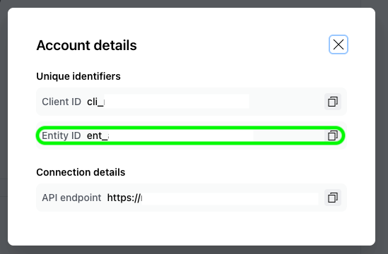 - Share your entity IDs and API credentials in a secured way with Payrails.