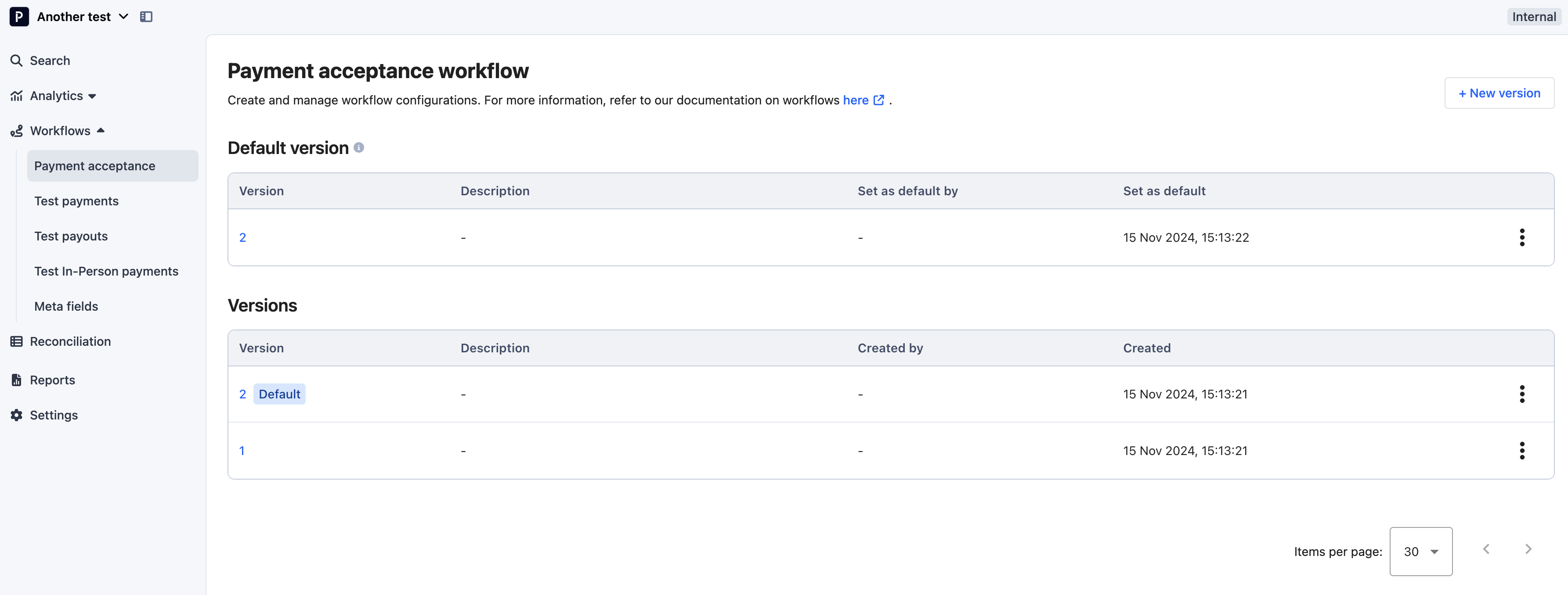 When a new workspace is created, a new empty version of the payment acceptance workflow is also automatically created - a version 1.