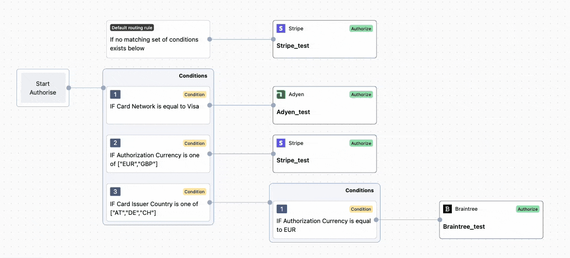 - Example: “IF Card Issuer Country is one of AT,DE,CH AND Authorization Currency is equal to EUR THEN authorize via Braintree”