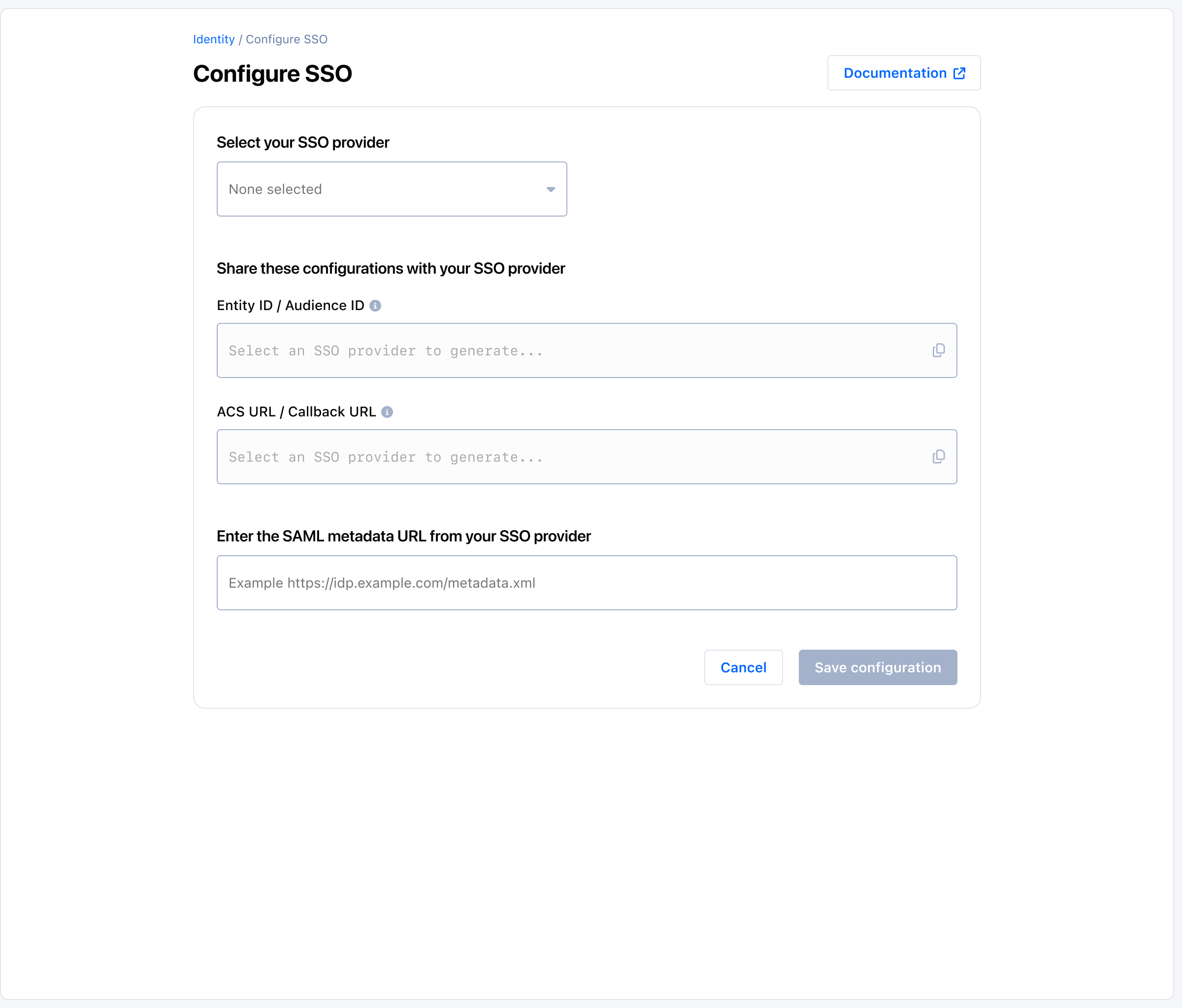 - From the provider dropdown, choose your IdP (Okta, JumpCloud, Google Workspace, Microsoft Entra/Azure AD, or Auth0). This helps the Portal tailor the guidance you see.