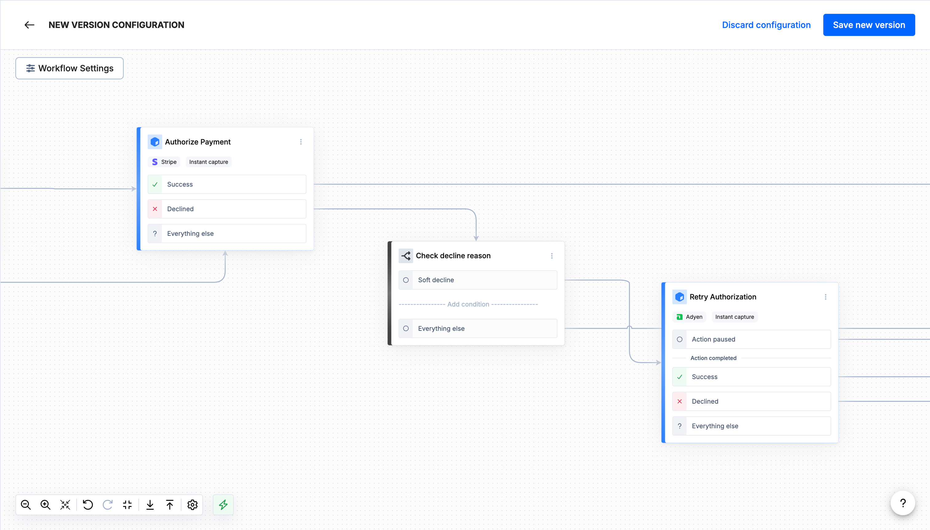Workflow Studio is a visual drag-and-drop editor for building payment workflows. Instead of writing code, you design workflows by placing steps on a canvas and connecting them with lines that define the order of operations. Each workflow models a specific payment process — from authorizing a transaction to handling refunds and disputes.